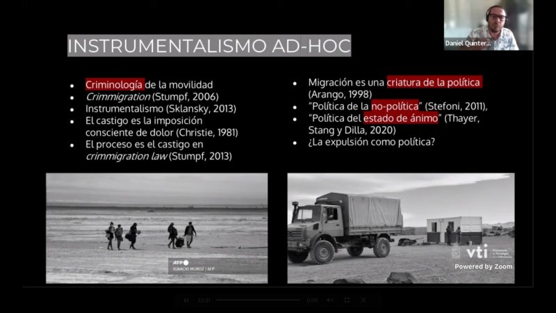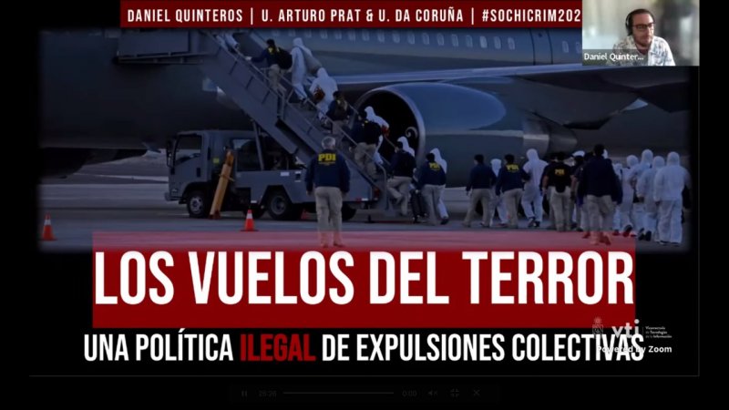 El profesor colaborador del Magíster en Relaciones Internacionales y Estudios Transfronterizos MARIET del INTE, Mg. Daniel Quinteros, participó en la mesa 9 Criminología de la Movilidad con la ponencia titulada “Los Vuelos del Terror”: una política ilegal de expulsiones colectivas, en el II Congreso Internacional de la Sociedad Chilena de Criminología SOCHICRIM 2021: Desafíos en Tiempos de cambios. El evento fue co-organizado en conjunto con el Centro de Estudios en Seguridad Ciudadana (CESC) del Instituto de Asuntos Públicos de la Universidad de Chile.