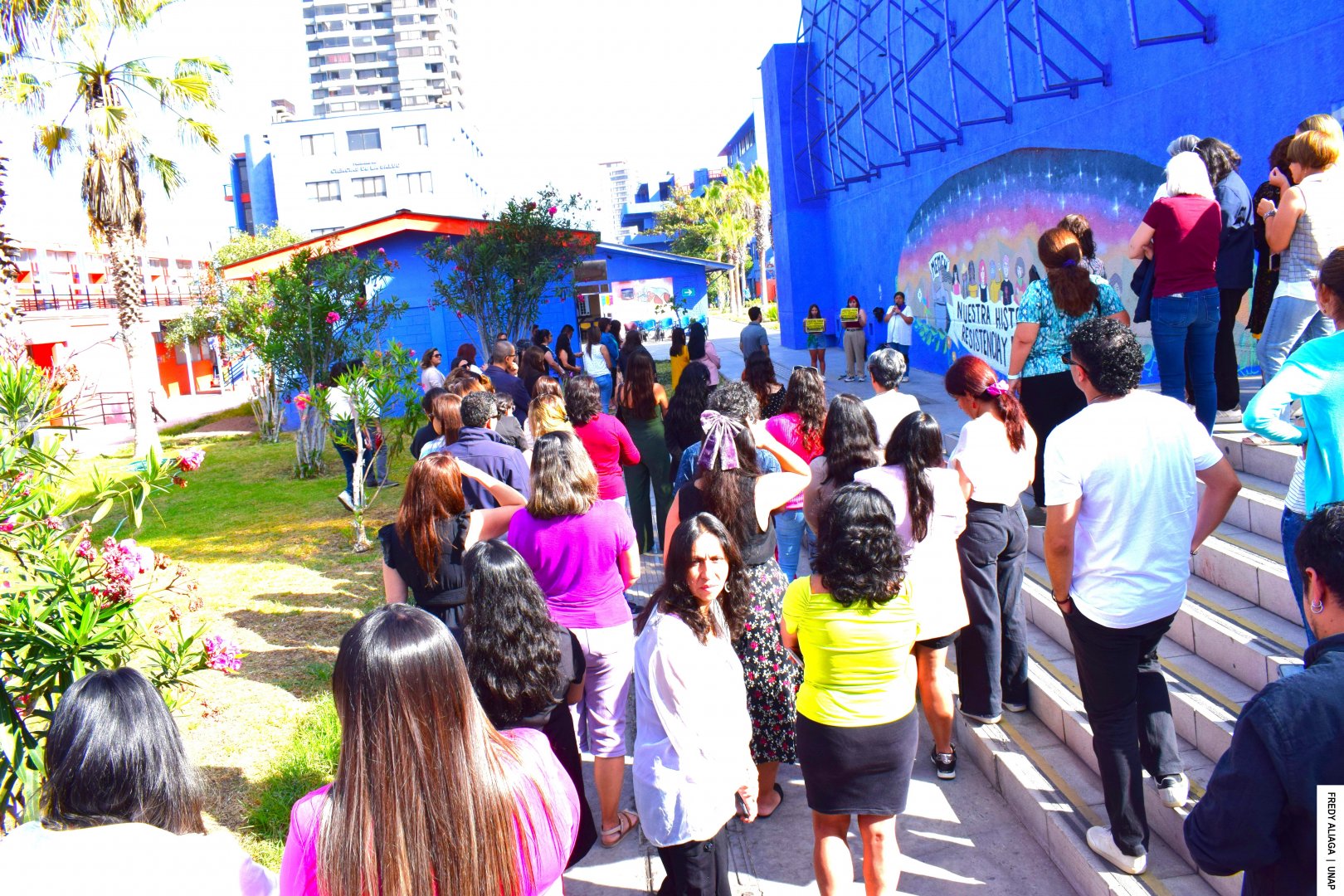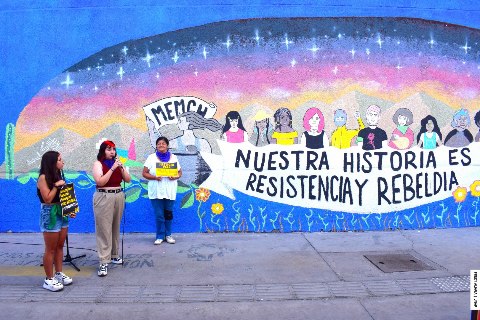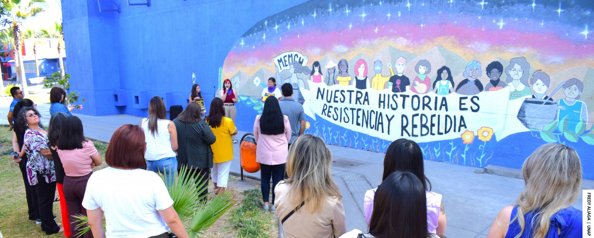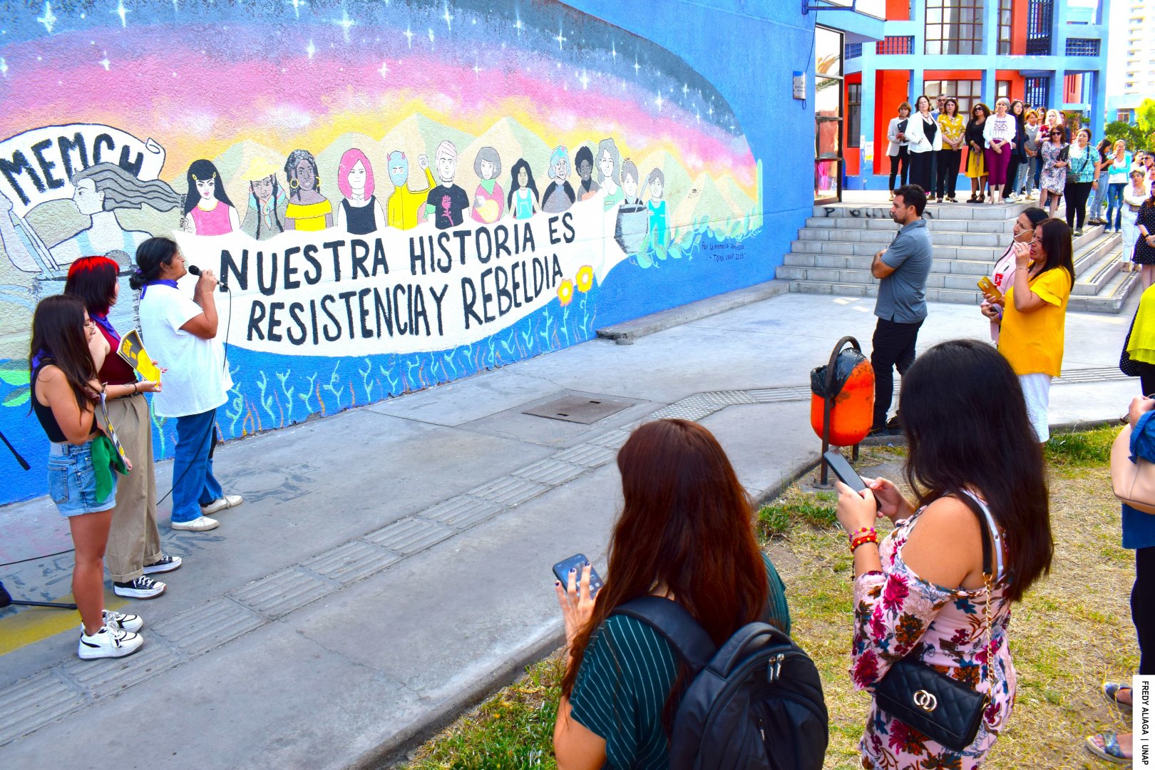 Yusant Figueroa, integrante de la Secretaría de Género y Sexualidad de la UNAP, expresó el significado del mural. “Lo elaboramos el año 2018, fue en el contexto de las movilizaciones feministas, por casos de acoso y de abuso y de violencia de género que se dan en los espacios educativos. Este año 2023 lo actualizamos, agregamos también la lucha histórica del Movimiento Pro-Emancipación de las Mujeres de Chile MEMCH (organización no gubernamental que busca la igualdad política, jurídica y laboral entre hombres y mujeres). También incorporamos la figura de la abogada Elena Caffarena, una referente en la lucha de los derechos humanos en Chile y la consigna es «Nuestra historia es resistencia y rebeldía», porque las mujeres y disidencias siempre hemos estado en un rol secundario en la historia, pero impulsando transformaciones”, manifestó.