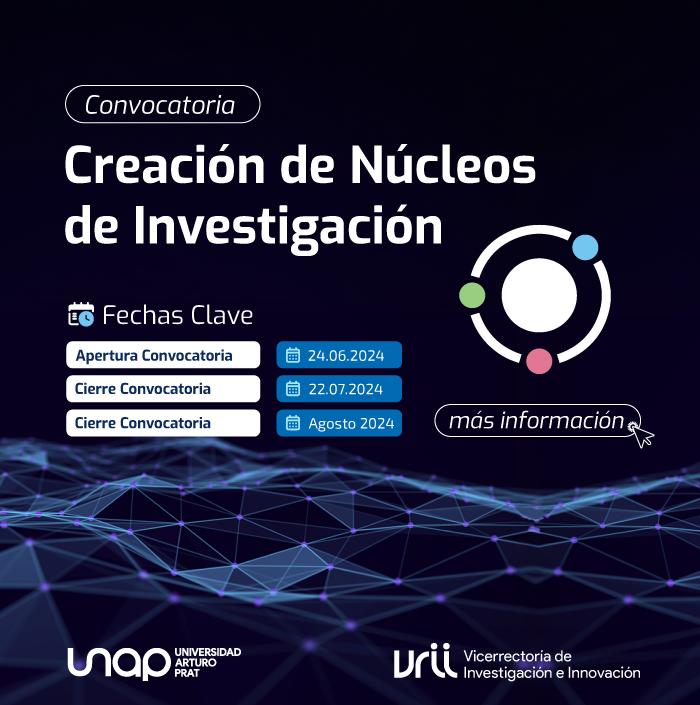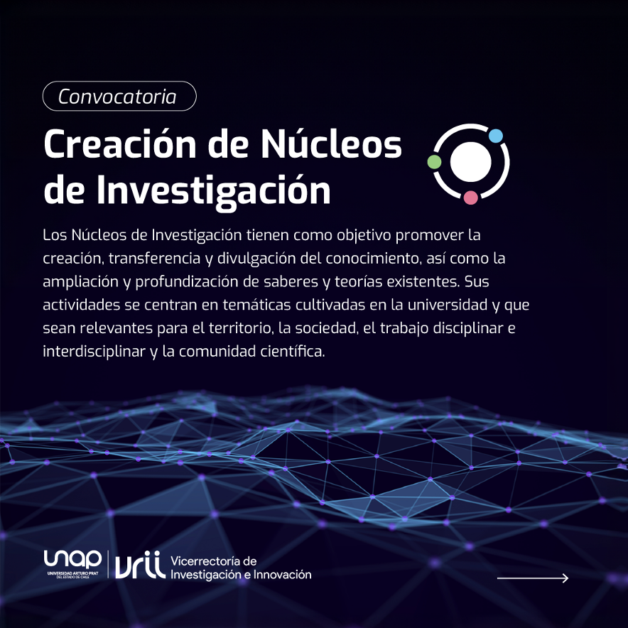 La Universidad Arturo Prat, a través de su Vicerrectoría de Investigación e Innovación (VRII) y en el marco del Proyecto de Educación Superior Regional (ESR) UAP 2395, abre la siguiente convocatoria para la creación de Núcleos de Investigación.