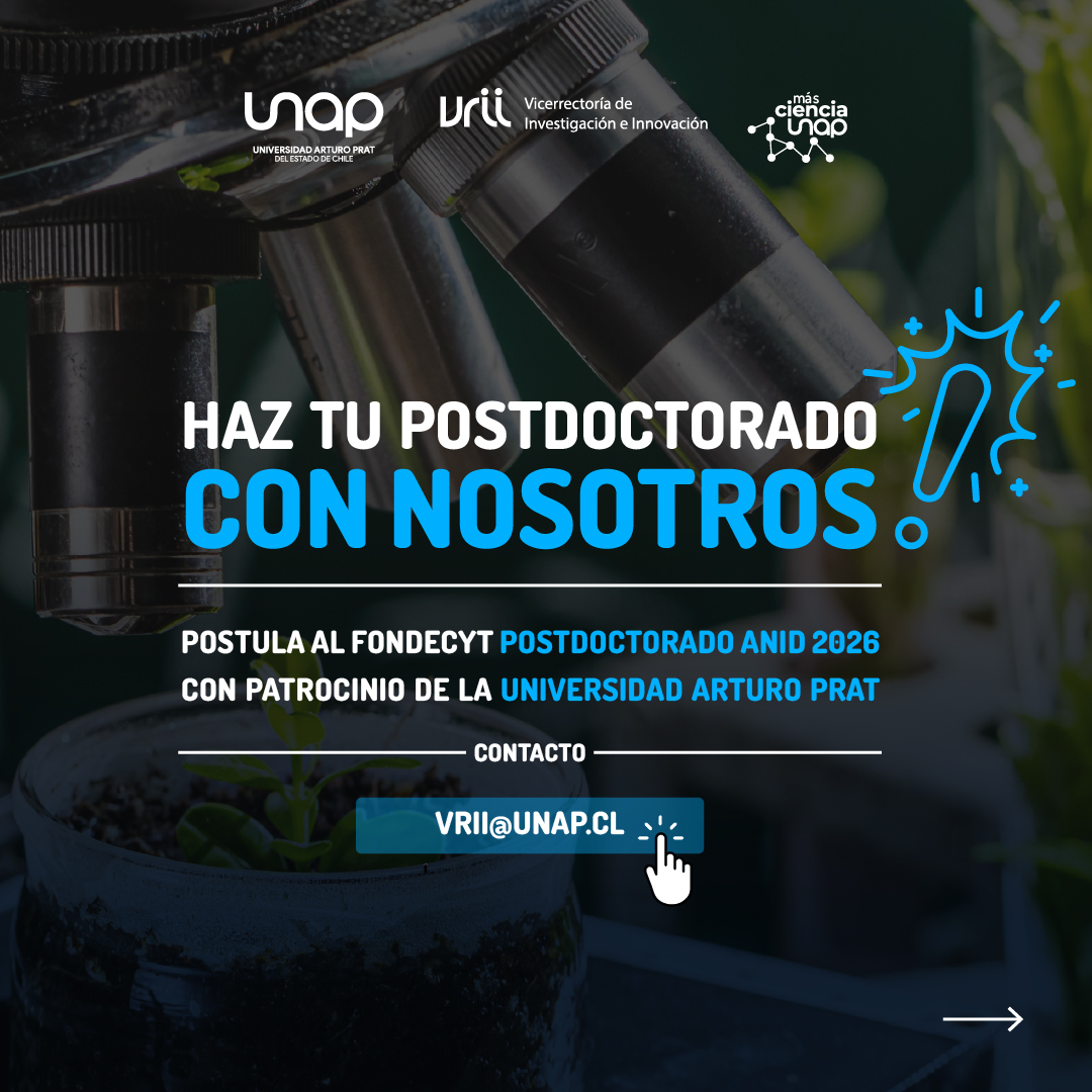 La Universidad Arturo Prat (UNAP), a través de su Vicerrectoría de Investigación e Innovación (VRII), abre la convocatoria para patrocinar a investigadoras e investigadores al concurso FONDECYT Postdoctorado 2026 de la Agencia Nacional de Investigación y Desarrollo (ANID).