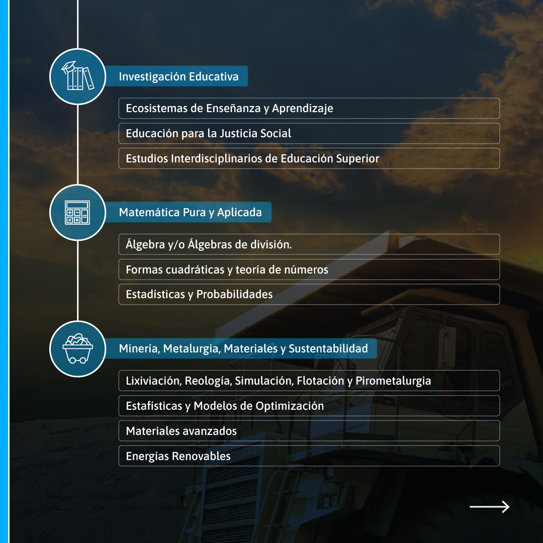 - Lixiviación, Reología, Simulación, Flotación y Pirometalurgia.