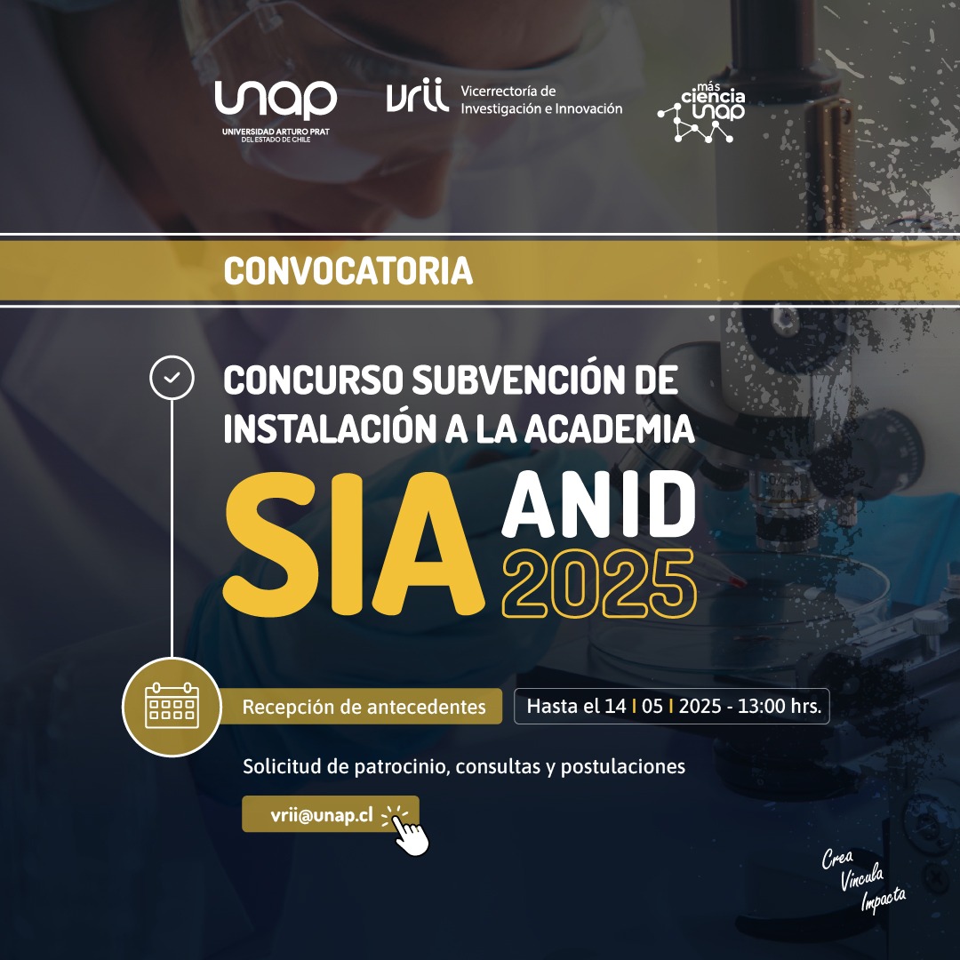 La Universidad Arturo Prat abre la siguiente convocatoria para patrocinar a doctoras y doctores para postular al Concurso Subvención de Instalación a la Academia (SIA), 2025 de la Agencia Nacional de Investigación y Desarrollo (ANID), en las áreas y líneas señaladas al final de la presente convocatoria.