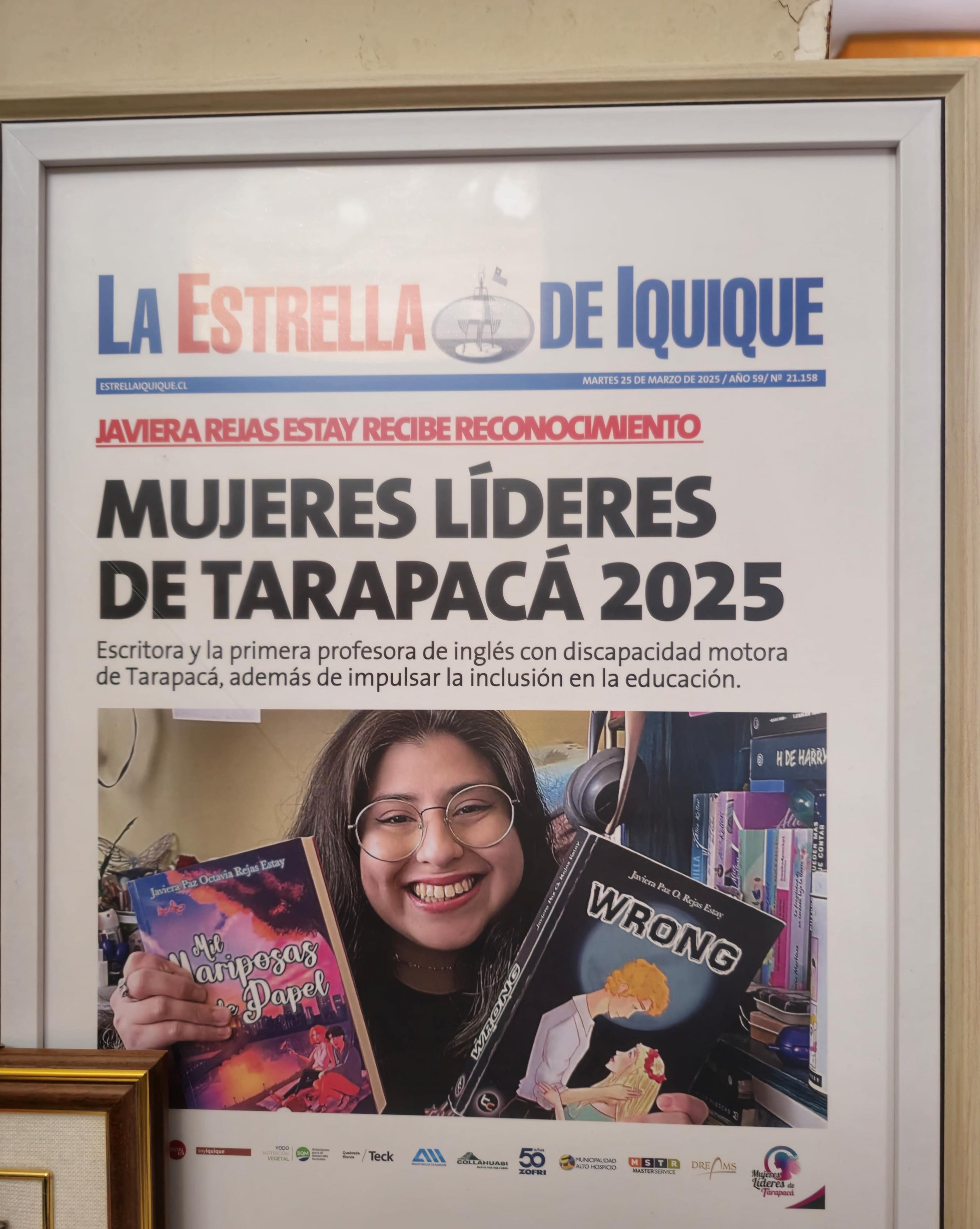 En tanto, Javiera Rejas Estay, profesora de inglés, escritora y editora, creadora de contenido e integrante del Consejo de la Sociedad Civil y titulada de la carrera de Pedagogía en Inglés para Enseñanza Preescolar, Básica y Media de la Universidad Arturo Prat, comentó que "Recibir este reconocimiento como una de las 16 mujeres líderes de Tarapacá 2025 es un gran honor. Soy escritora, editora y la primera profesora de inglés con discapacidad de la región, titulada en la Universidad Arturo Prat en la generación 2022, en plena fase final de la pandemia. A través de CECREA y diversas charlas, he podido aportar a la educación y visibilizar la importancia de la inclusión. Mi discapacidad es de tipo motora, una diparesia espástica producto de una parálisis cerebral. Estoy muy agradecida por este reconocimiento".