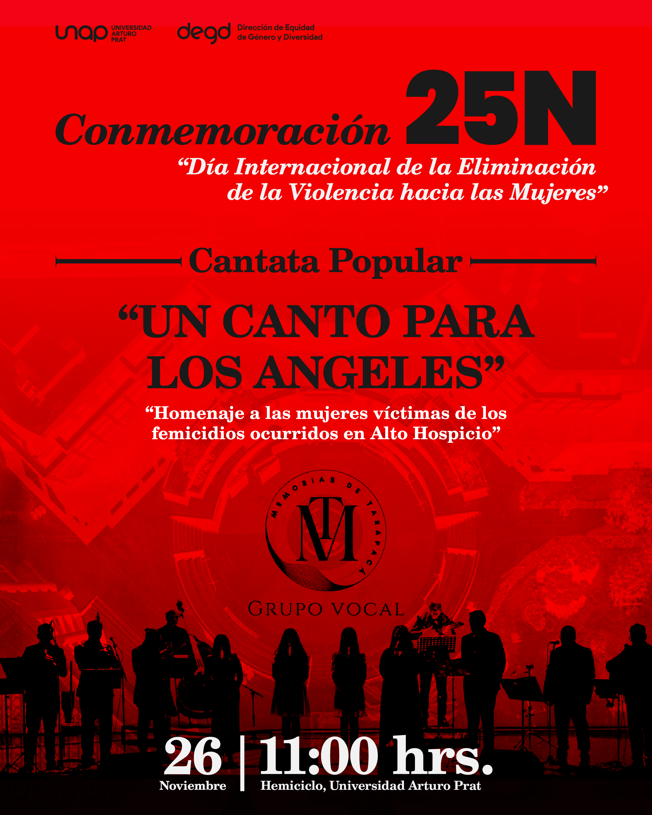 La Universidad Arturo Prat (UNAP) realizará una actividad conmemorativa este miércoles 26 de noviembre, a las 10:00 horas en el Hemiciclo, en el marco del Día Internacional de la Erradicación de la Violencia hacia las Mujeres. La instancia busca promover la reflexión colectiva, honrar la memoria de las víctimas y reafirmar el compromiso institucional en la erradicación de la violencia de género.