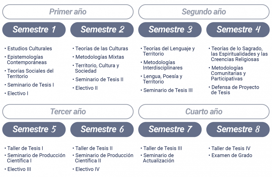 El Doctorado es presencial, con dedicación exclusiva y posee un total de 240 créditos-SCT con la siguiente distribución: