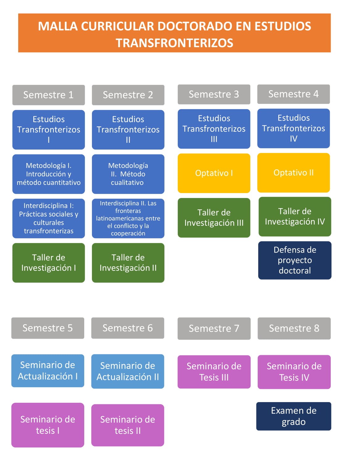 El Doctorado en Estudios Transfronterizos es de carácter interdisciplinario, lo que implica la colaboración e interacción entre varias disciplinas del conocimiento, con el propósito de indagar en los asuntos transfronterizos. Estos, considerados como multidimensionales, requieren ser abordados a partir de la combinación de distintos enfoques teóricos y metodológicos provenientes de diversas disciplinas como los estudios geográficos, históricos, jurídicos, ambientales, económicos, sociológicos, antropológicos, politológicos e internacionales.